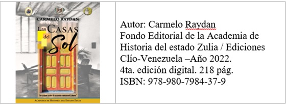 El libro Casas del Sol de Carmelo Raydan es una investigación sobre la evolución arquitectónica de la vivienda urbana tradicional del estado Zulia. Para este estudio se consideraron los factores, regionales, nacionales y foráneos, de índole cultural, ambiental, económicos y políticos, que incidieron determinantemente sobre las continuas transformaciones de las viviendas zulianas. El trabajo abarca cronológicamente desde los tiempos previos a la conquista española, la segunda mitad del siglo XV, hasta la década de 1940, cuando debido a los cambios que generó en la sociedad venezolana la explotación petrolera y nuestra condición de país dependiente dentro del sistema capitalista mundial, se dejan de edificar.